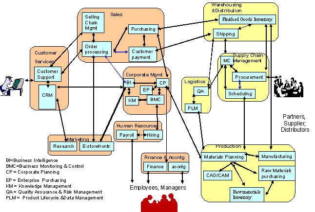 These patterns capture a high level view of enterprise functional areas (e.g., procurement, corporate management, back-office operations), the major business processes in each functional area (e.g., purchasing and payment within procurement) and the key interactions between these processes. For example, Figure 1, gives a very high level view of a manufacturing company and its key business processes.